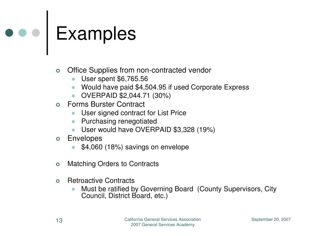 Examples • Office Supplies from non-contracted vendor • User spent $6,765.56 • Would have paid $4,504.95 if used Corporate Express • OVERPAID $2,044.71 (30%) • Forms Burster Contract • User signed contract for List Price • Purchasing renegotiated • User would have OVERPAID $3,328 (19%) • Envelopes • $4,060 (18%) savings on envelope • Matching Orders to Contracts • Retroactive Contracts • Must be ratified by Governing Board (County Supervisors, City Council, District Board, etc.) California General Services Association 2007 General Services Academy