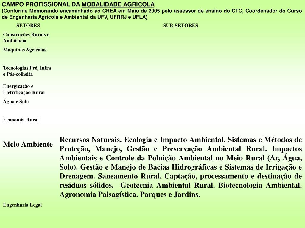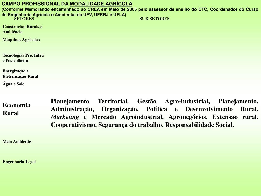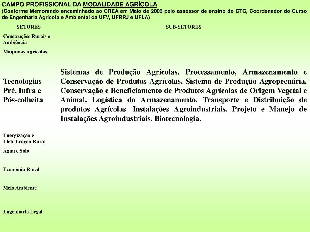 CAMPO PROFISSIONAL DA MODALIDADE AGRÍCOLA (Conforme Memorando encaminhado ao CREA em Maio de 2005 pelo assessor de ensino do CTC, Coordenador do Curso de Engenharia Agrícola e Ambiental da UFV, UFRRJ e UFLA)