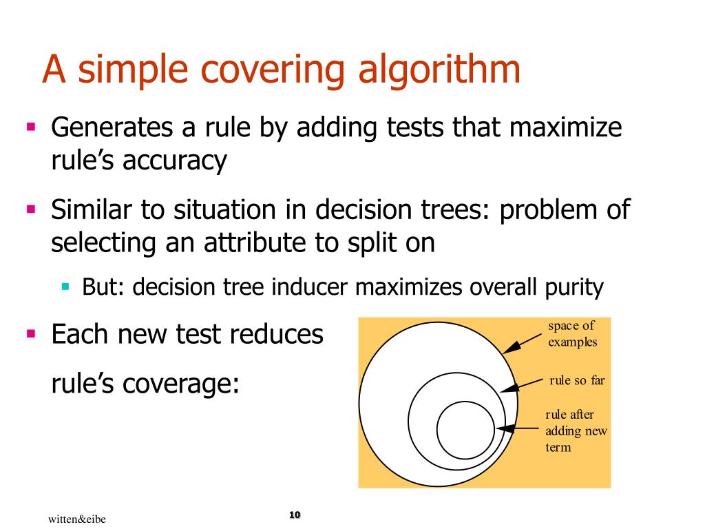 A simple covering algorithm • Generates a rule by adding tests that maximize rule’s accuracy • Similar to situation in decision trees: problem of selecting an attribute to split on • But: decision tree inducer maximizes overall purity • Each new test reduces rule’s coverage: witten&eibe