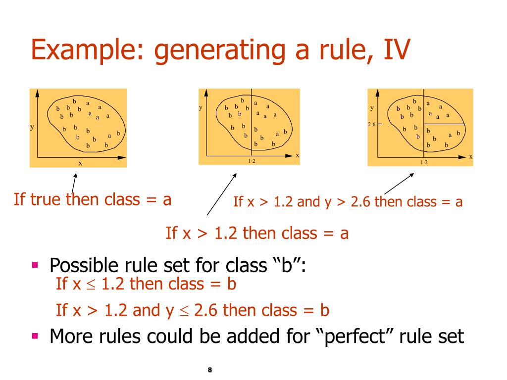 Example: generating a rule, IV • Possible rule set for class “b”: • More rules could be added for “perfect” rule set