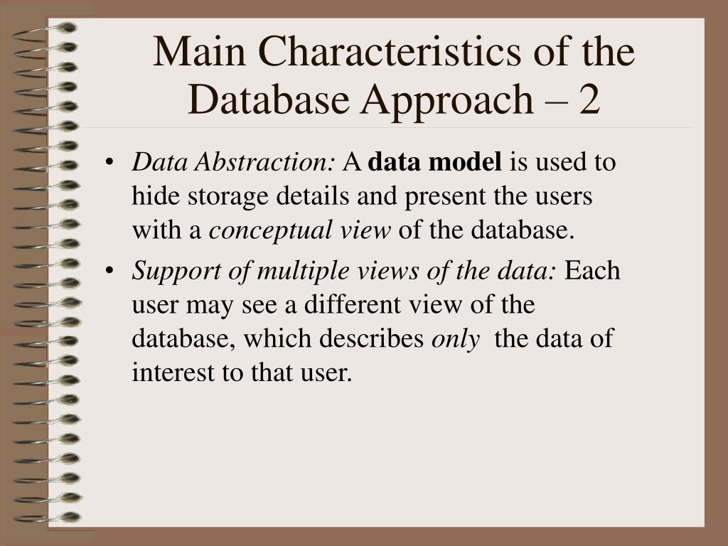 Main Characteristics of the Database Approach – 2 • Data Abstraction: A data model is used to hide storage details and present the users with a conceptual view of the database. • Support of multiple views of the data: Each user may see a different view of the database, which describes only the data of interest to that user.