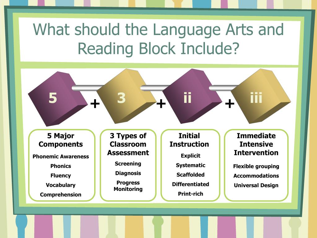 5 3 ii iii + + + 3 Types of Classroom Assessment Initial Instruction Immediate Intensive Intervention 5 Major Components Explicit Systematic Scaffolded Differentiated Print-rich Phonemic Awareness Phonics Fluency Vocabulary Comprehension Screening Diagnosis Progress Monitoring Flexible grouping Accommodations Universal Design What should the Language Arts and Reading Block Include?