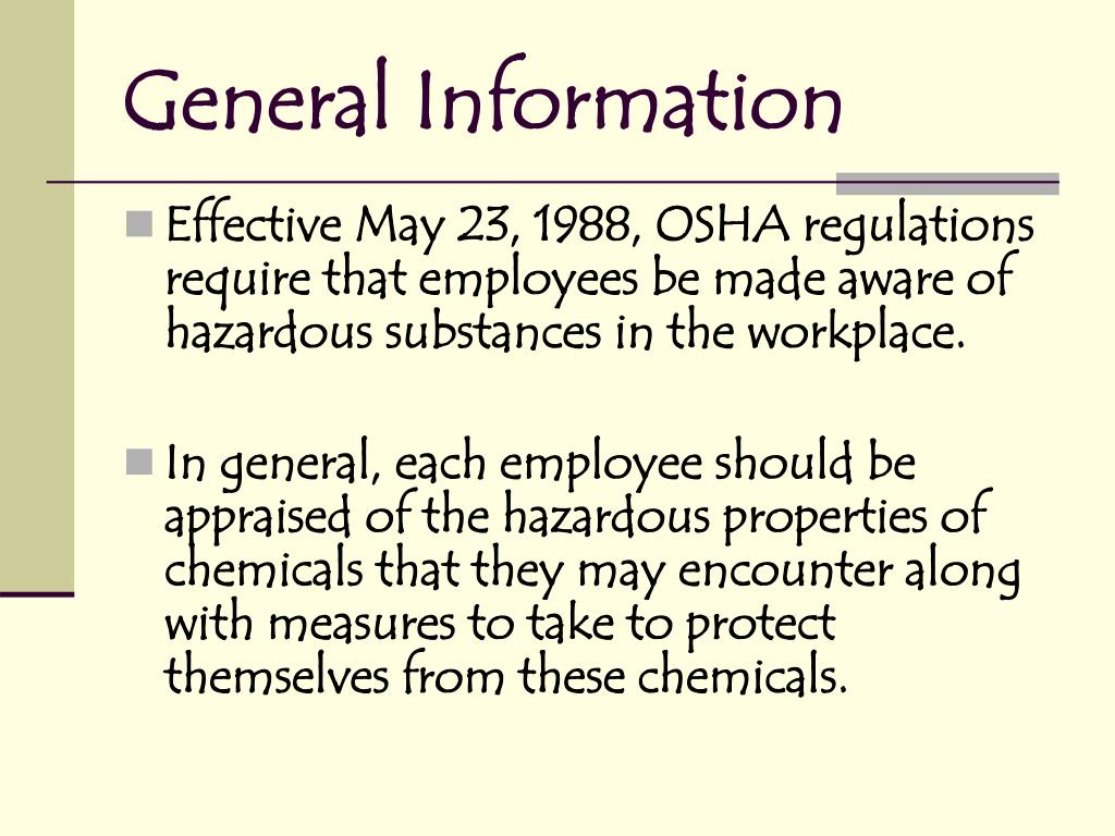 General Information • Effective May 23, 1988, OSHA regulations require that employees be made aware of hazardous substances in the workplace. • In general, each employee should be appraised of the hazardous properties of chemicals that they may encounter along with measures to take to protect themselves from these chemicals.