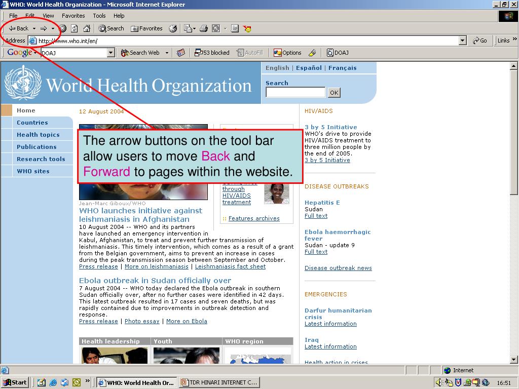 Entering a URL address in the address box After entering a URL address in the address box click Go or hit the RETURN key. In this example we have entered http://www.who.int for the WHO website