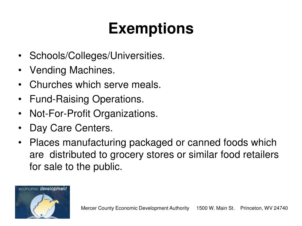 Exemptions • Schools/Colleges/Universities. • Vending Machines. • Churches which serve meals. • Fund-Raising Operations. • Not-For-Profit Organizations. • Day Care Centers. • Places manufacturing packaged or canned foods which are distributed to grocery stores or similar food retailers for sale to the public. Mercer County Economic Development Authority 1500 W. Main St. Princeton, WV 24740