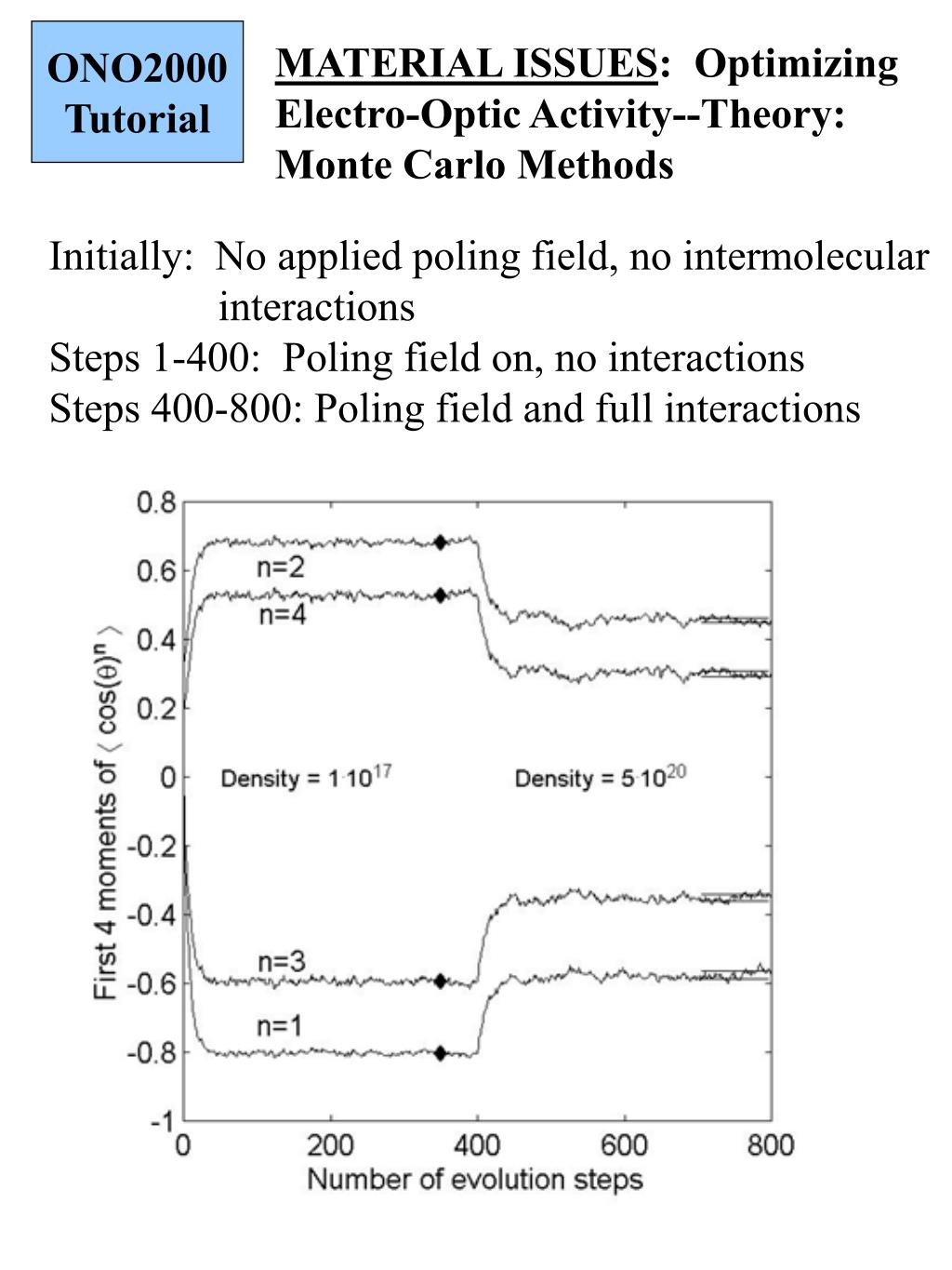 MATERIAL ISSUES: Optimizing Electro-Optic Activity--Theory: Monte Carlo Methods ONO2000Tutorial Initially: No applied poling field, no intermolecular interactions Steps 1-400: Poling field on, no interactions Steps 400-800: Poling field and full interactions