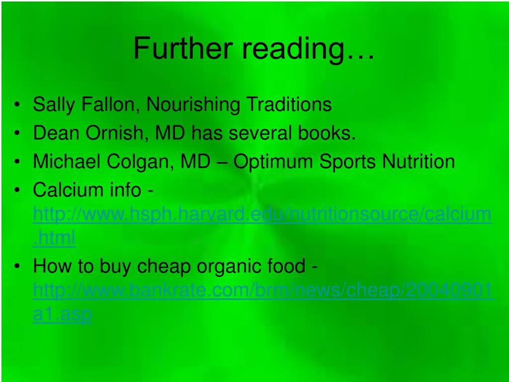 Further reading… • Sally Fallon, Nourishing Traditions • Dean Ornish, MD has several books. • Michael Colgan, MD – Optimum Sports Nutrition • Calcium info -http://www.hsph.harvard.edu/nutritionsource/calcium.html • How to buy cheap organic food - http://www.bankrate.com/brm/news/cheap/20040901a1.asp