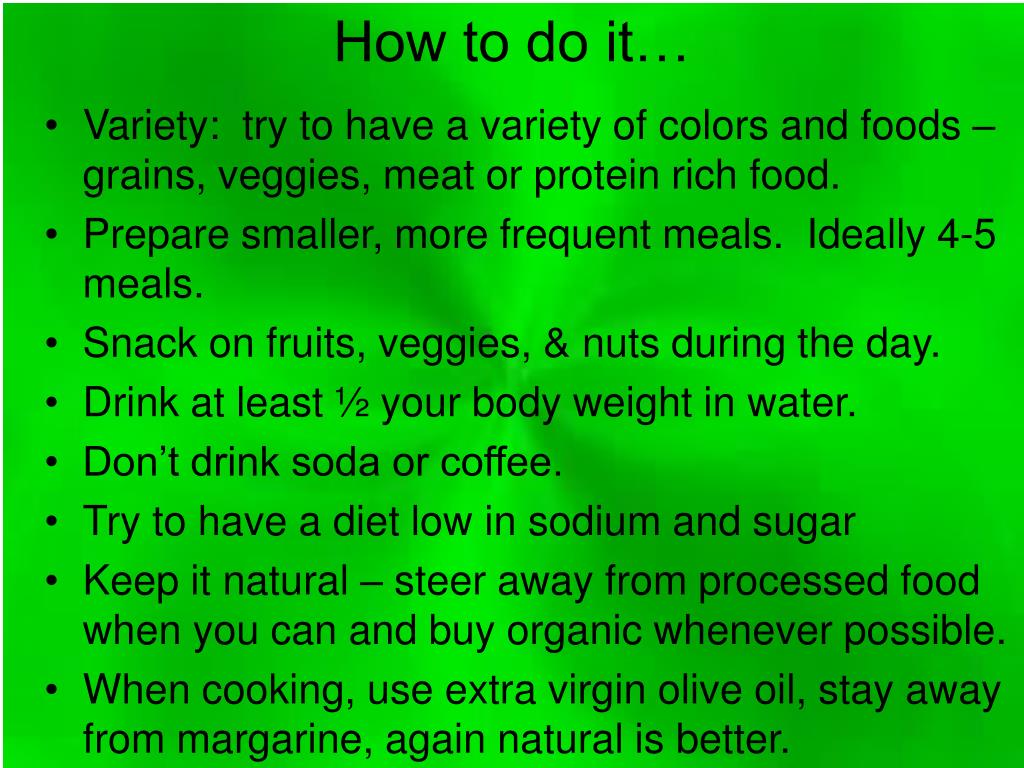 How to do it… • Variety: try to have a variety of colors and foods – grains, veggies, meat or protein rich food. • Prepare smaller, more frequent meals. Ideally 4-5 meals. • Snack on fruits, veggies, & nuts during the day. • Drink at least ½ your body weight in water. • Don’t drink soda or coffee. • Try to have a diet low in sodium and sugar • Keep it natural – steer away from processed food when you can and buy organic whenever possible. • When cooking, use extra virgin olive oil, stay away from margarine, again natural is better.