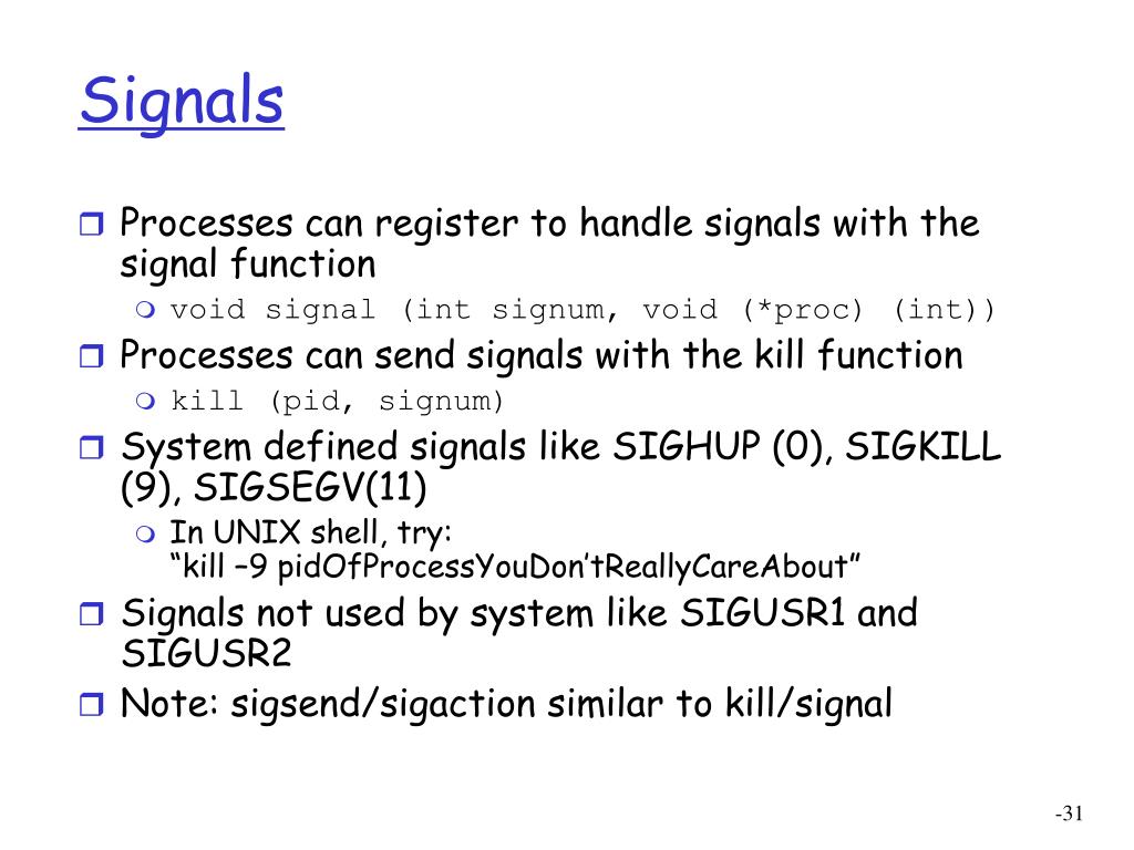Signals • Processes can register to handle signals with the signal function • void signal (int signum, void (*proc) (int)) • Processes can send signals with the kill function • kill (pid, signum) • System defined signals like SIGHUP (0), SIGKILL (9), SIGSEGV(11) • In UNIX shell, try: “kill –9 pidOfProcessYouDon’tReallyCareAbout” • Signals not used by system like SIGUSR1 and SIGUSR2 • Note: sigsend/sigaction similar to kill/signal