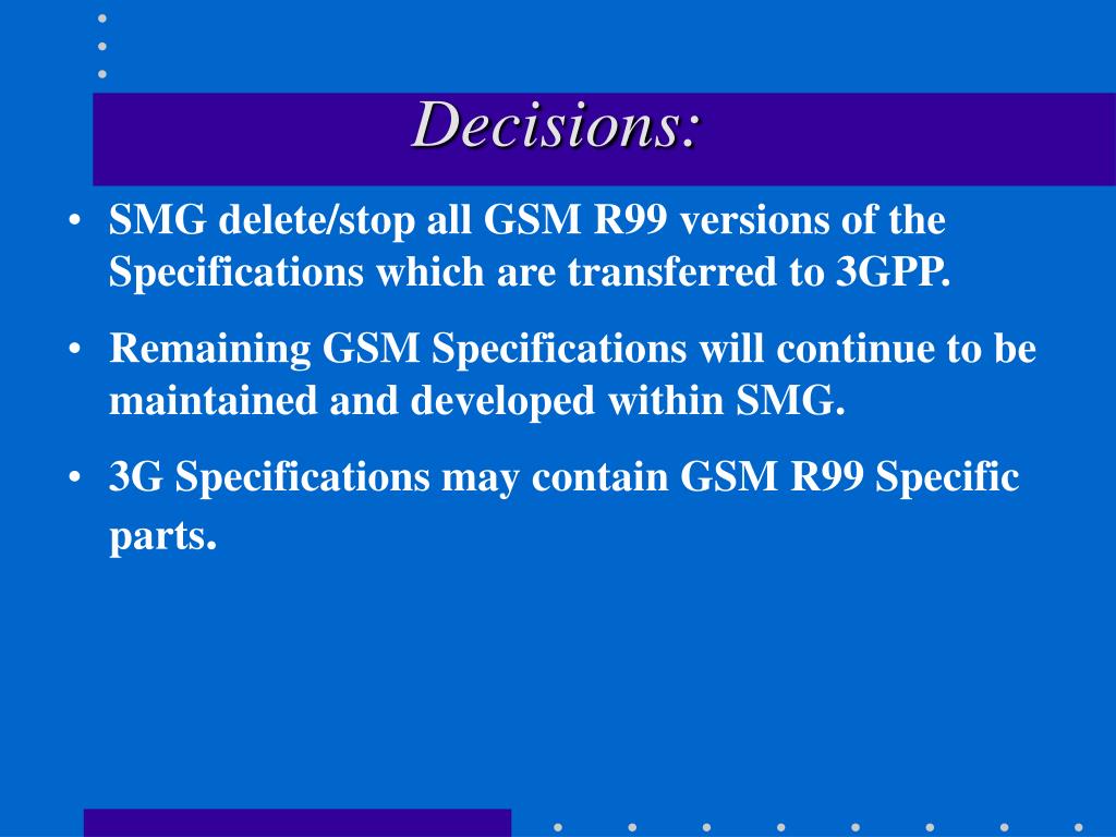 Decisions: • SMG delete/stop all GSM R99 versions of the Specifications which are transferred to 3GPP. • Remaining GSM Specifications will continue to be maintained and developed within SMG. • 3G Specifications may contain GSM R99 Specific parts.