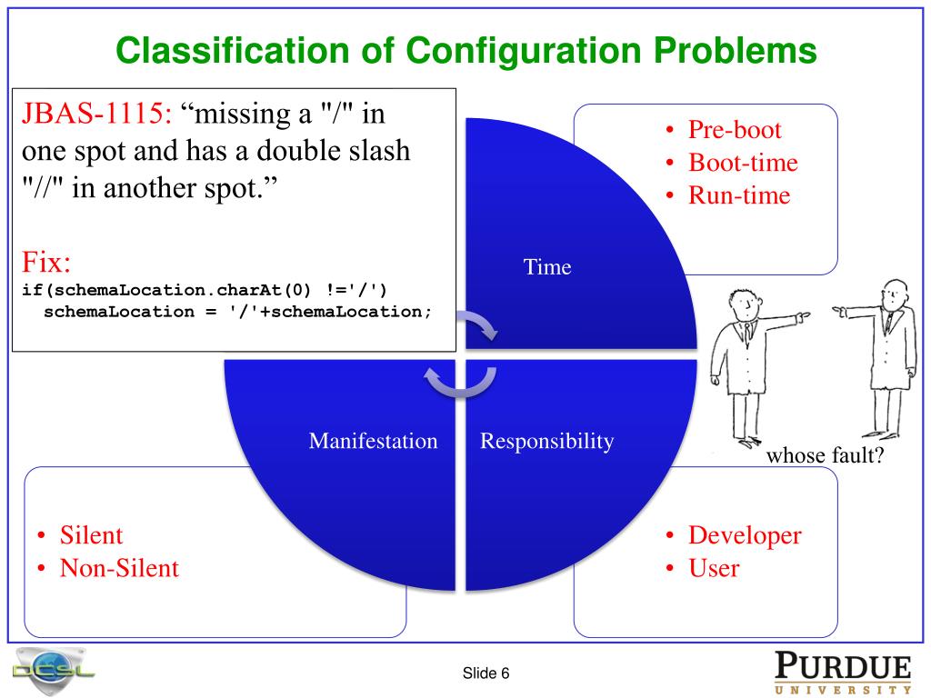 Classification of Configuration Problems JBAS-1115: “missing a "/" in one spot and has a double slash "//" in another spot.” Fix: if(schemaLocation.charAt(0) !='/') schemaLocation = '/'+schemaLocation; whose fault?