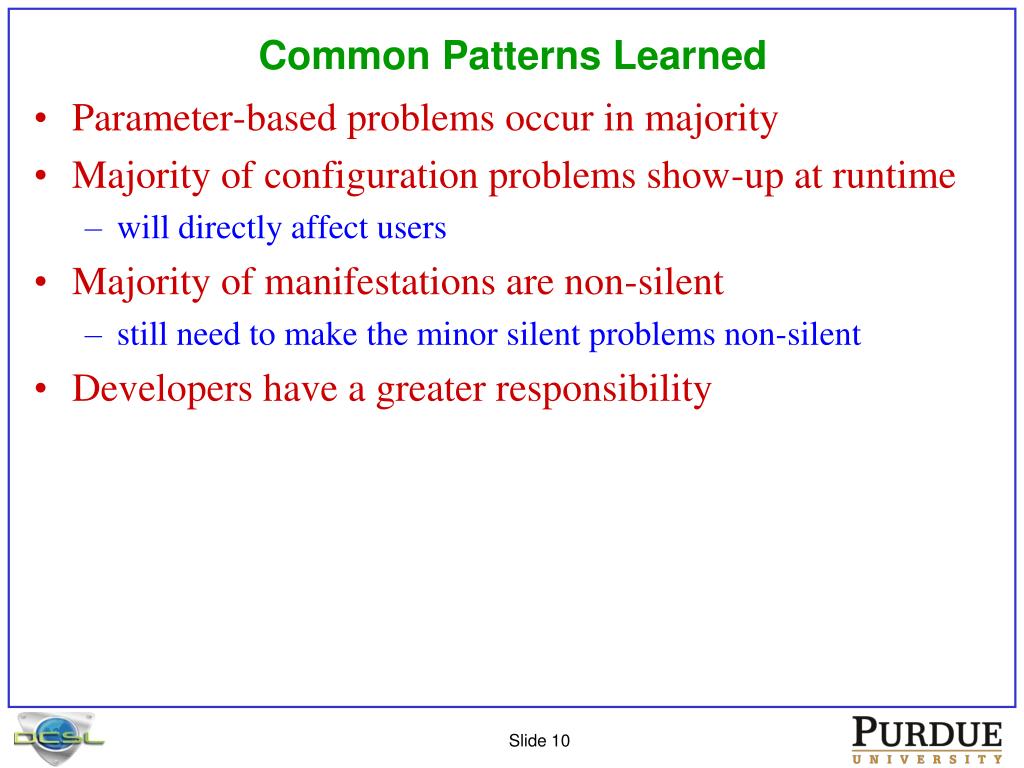 Common Patterns Learned • Parameter-based problems occur in majority • Majority of configuration problems show-up at runtime • will directly affect users • Majority of manifestations are non-silent • still need to make the minor silent problems non-silent • Developers have a greater responsibility