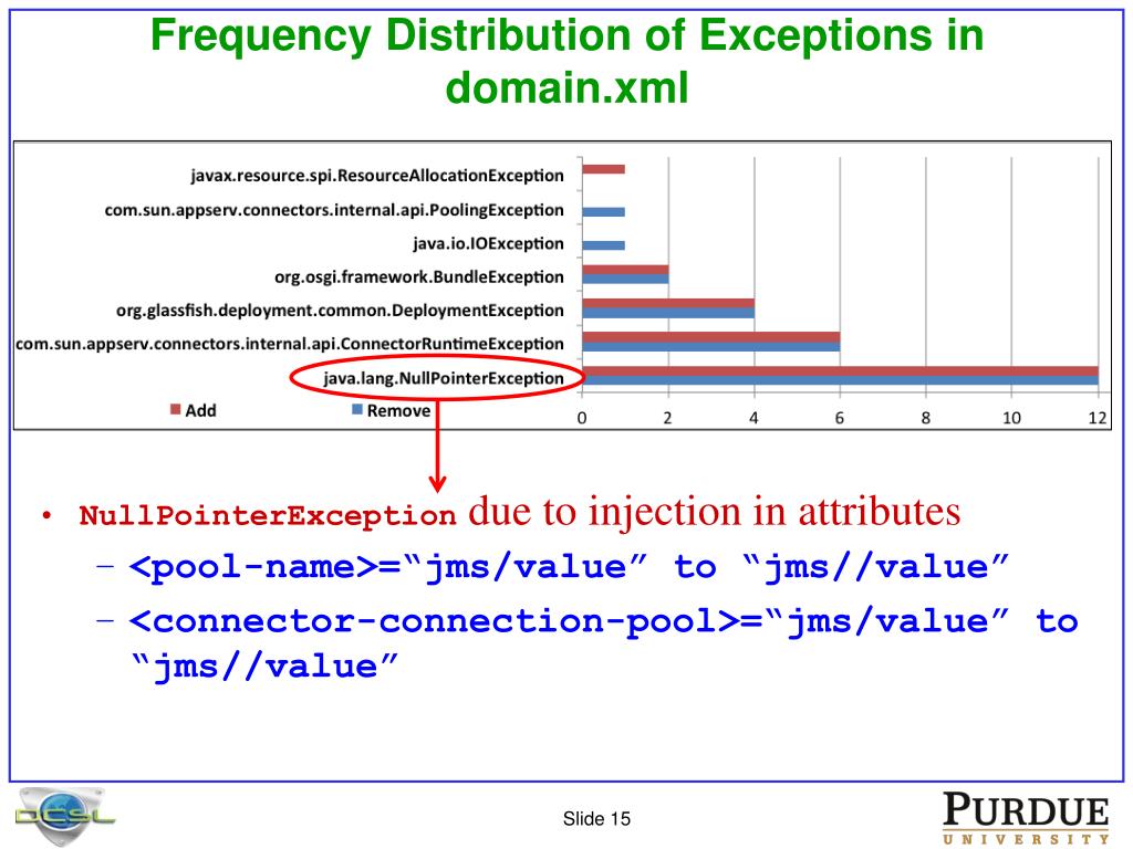 Frequency Distribution of Exceptions in domain.xml • NullPointerExceptiondue to injection in attributes • <pool-name>=“jms/value” to “jms//value” • <connector-connection-pool>=“jms/value” to “jms//value”