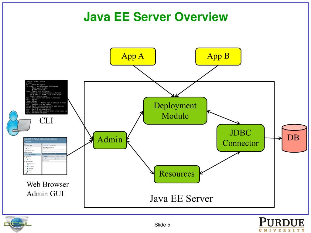Java EE Server Overview App A App B Java EE Server Deployment Module CLI DB JDBC Connector Admin Resources Web Browser Admin GUI