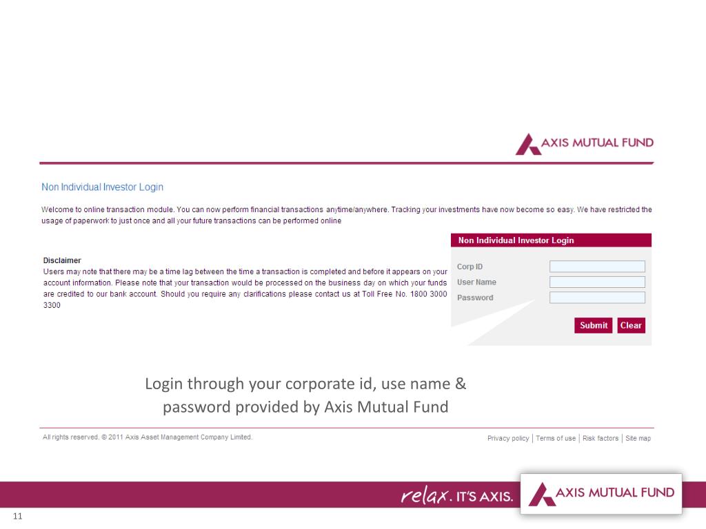 Login through your corporate id, use name & password provided by Axis Mutual Fund