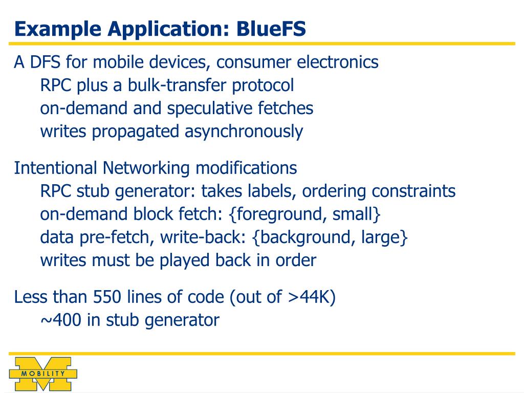 Example Application: BlueFS • A DFS for mobile devices, consumer electronics • RPC plus a bulk-transfer protocol • on-demand and speculative fetches • writes propagated asynchronously • Intentional Networking modifications • RPC stub generator: takes labels, ordering constraints • on-demand block fetch: {foreground, small} • data pre-fetch, write-back: {background, large} • writes must be played back in order • Less than 550 lines of code (out of >44K) • ~400 in stub generator