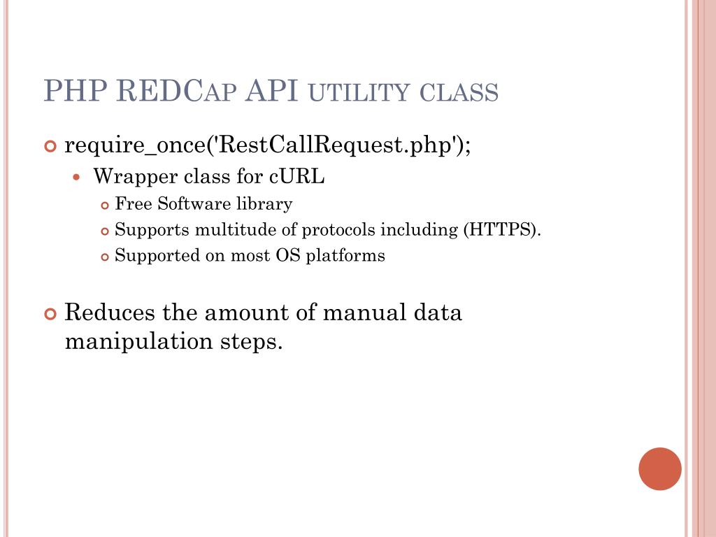 PHP REDCap API utility class • require_once('RestCallRequest.php'); • Wrapper class for cURL • Free Software library • Supports multitude of protocols including (HTTPS). • Supported on most OS platforms • Reduces the amount of manual data manipulation steps.