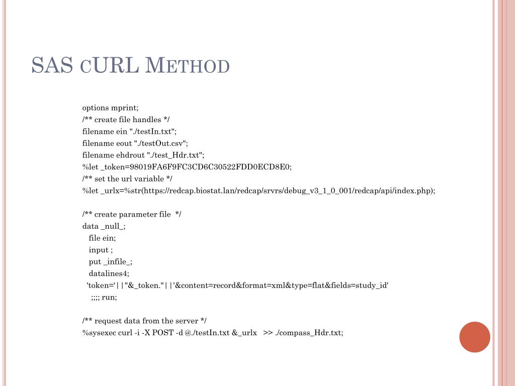 SAS cURL Method options mprint; /** create file handles */ filename ein "./testIn.txt"; filename eout "./testOut.csv"; filename ehdrout "./test_Hdr.txt"; %let _token=98019FA6F9FC3CD6C30522FDD0ECD8E0; /** set the url variable */ %let _urlx=%str(https://redcap.biostat.lan/redcap/srvrs/debug_v3_1_0_001/redcap/api/index.php); /** create parameter file */ data _null_; file ein; input ; put _infile_; datalines4; 'token='||"&_token."||'&content=record&format=xml&type=flat&fields=study_id' ;;;; run; /** request data from the server */ %sysexec curl -i -X POST -d @./testIn.txt &_urlx >> ./compass_Hdr.txt;