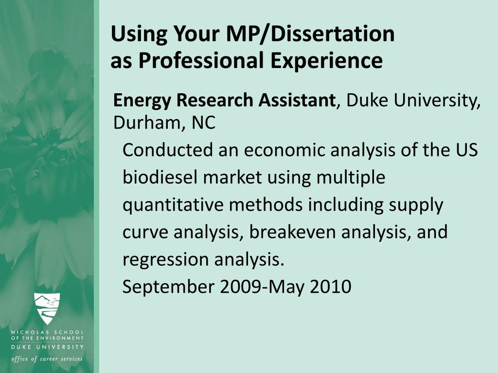 Using Your MP/Dissertation as Professional Experience Energy Research Assistant, Duke University, Durham, NC Conducted an economic analysis of the US biodiesel market using multiple quantitative methods including supply curve analysis, breakeven analysis, and regression analysis. September 2009-May 2010