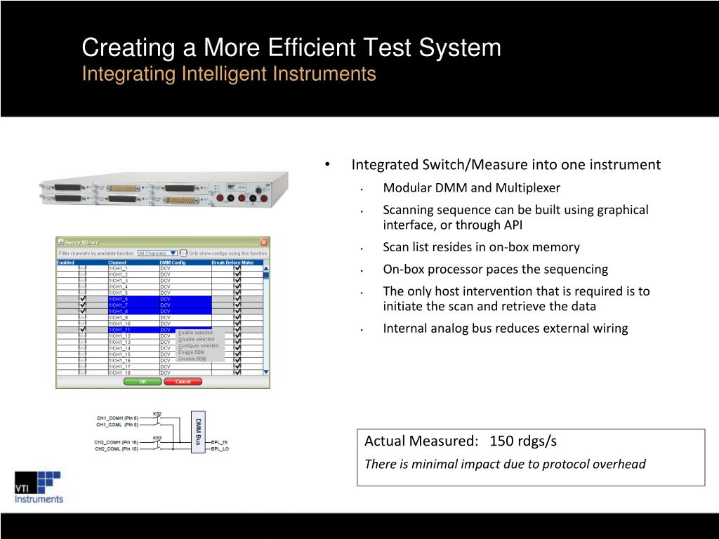 Creating a More Efficient Test SystemIntegrating Intelligent Instruments • Integrated Switch/Measure into one instrument • Modular DMM and Multiplexer • Scanning sequence can be built using graphical interface, or through API • Scan list resides in on-box memory • On-box processor paces the sequencing • The only host intervention that is required is to initiate the scan and retrieve the data • Internal analog bus reduces external wiring Actual Measured: 150 rdgs/s There is minimal impact due to protocol overhead