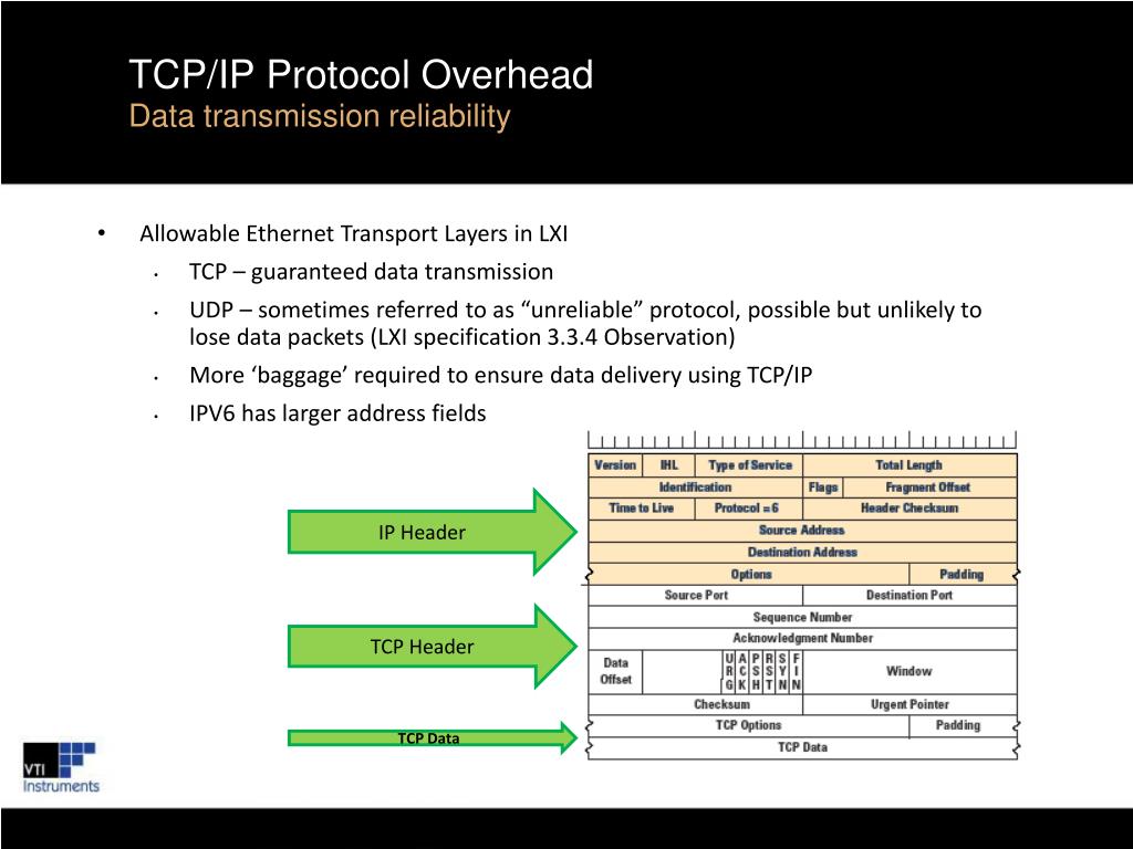 TCP/IP Protocol OverheadData transmission reliability • Allowable Ethernet Transport Layers in LXI • TCP – guaranteed data transmission • UDP – sometimes referred to as “unreliable” protocol, possible but unlikely to lose data packets (LXI specification 3.3.4 Observation) • More ‘baggage’ required to ensure data delivery using TCP/IP • IPV6 has larger address fields IP Header TCP Header TCP Data