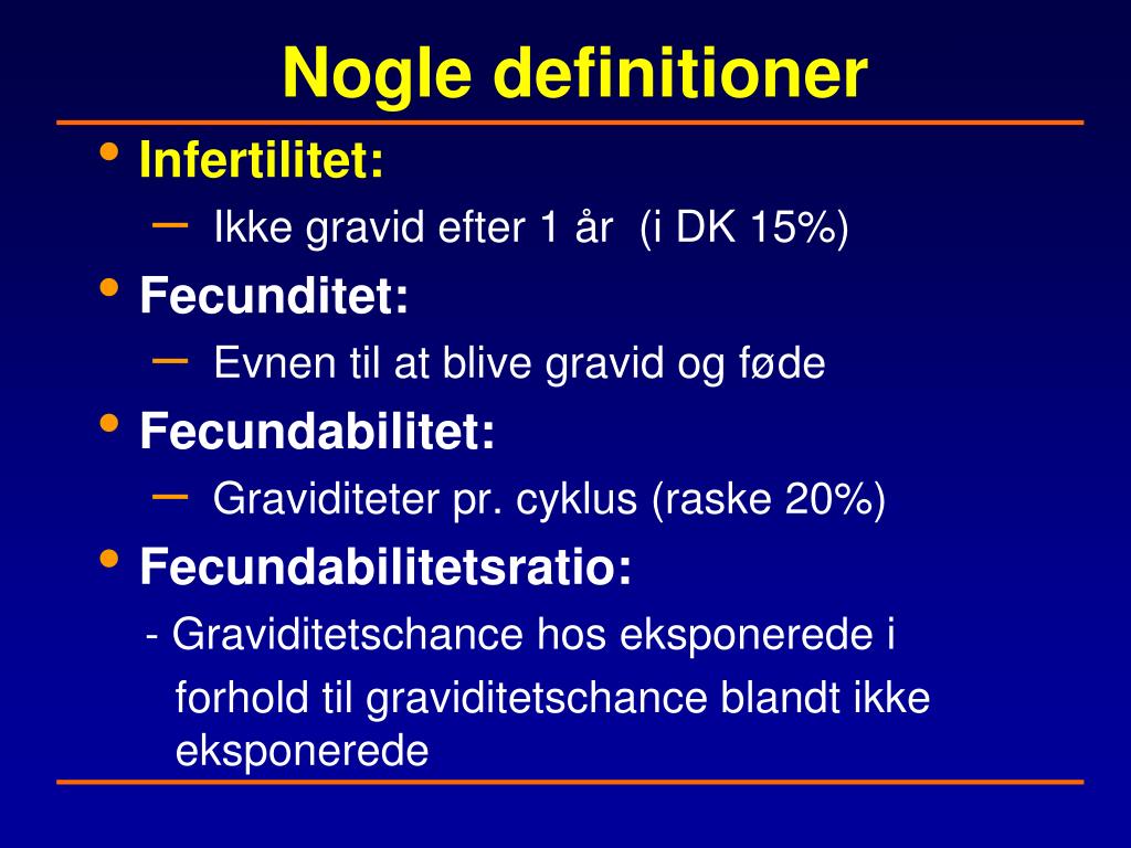 Nogle definitioner • Infertilitet: • Ikke gravid efter 1 år (i DK 15%) • Fecunditet: • Evnen til at blive gravid og føde • Fecundabilitet: • Graviditeter pr. cyklus (raske 20%) • Fecundabilitetsratio: - Graviditetschance hos eksponerede i forhold til graviditetschance blandt ikke eksponerede
