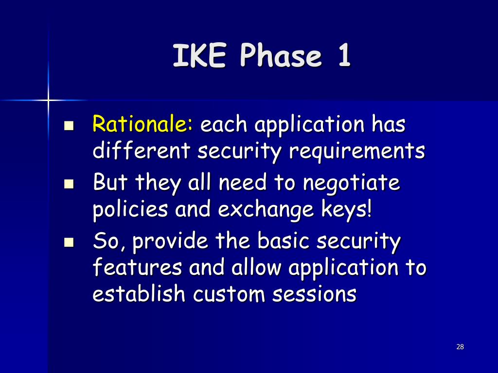 IKE Phase 1 • Rationale: each application has different security requirements • But they all need to negotiate policies and exchange keys! • So, provide the basic security features and allow application to establish custom sessions