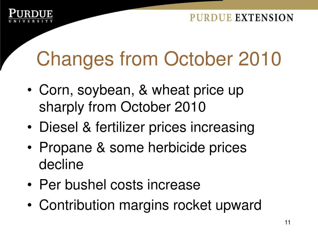 January 2011 Purdue Crop Cost & Return Guide . Craig Dobbins, Alan Miller, Bruce Erickson . Purdue University is an Equal Opportunity/Equal Access institution. Changes from Oct 2010. Corn price up $0.74/bu. Bean price up $1.52/bu. Wheat price up $1.21/bu.