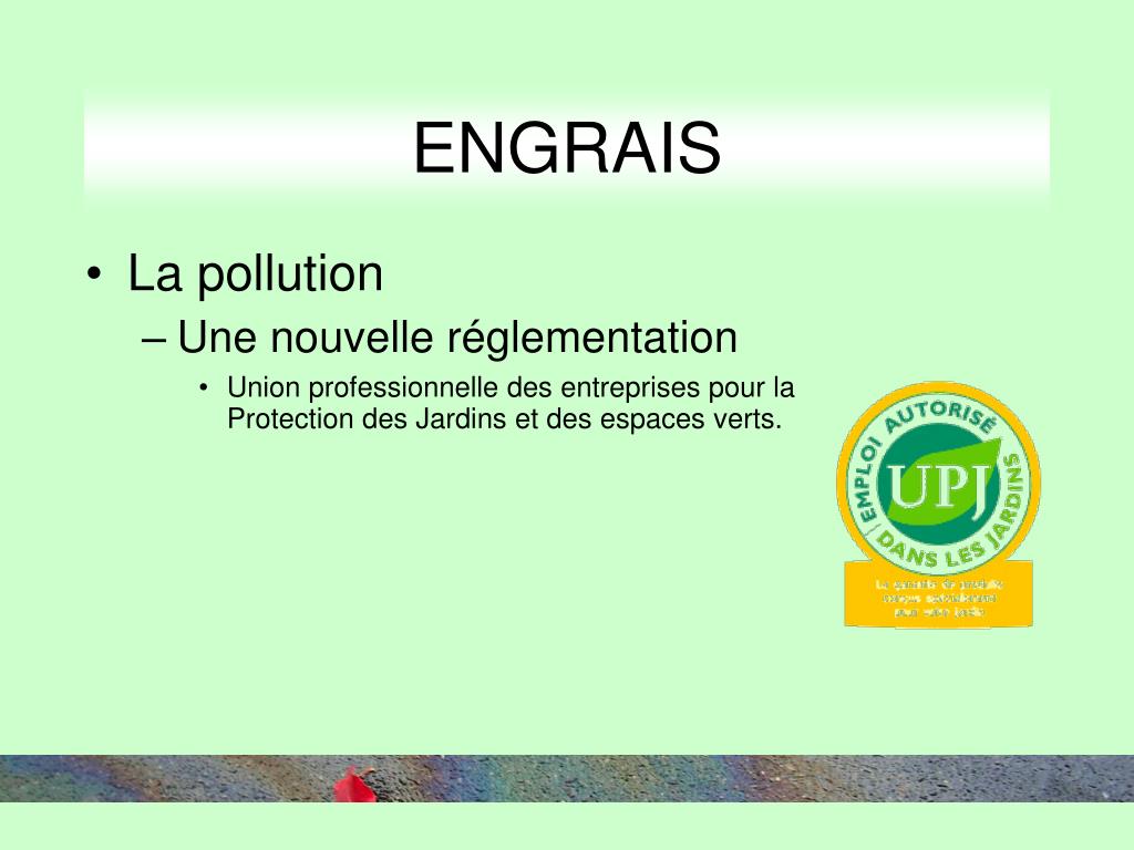 ENGRAIS • La pollution • Une nouvelle réglementation • Union professionnelle des entreprises pour la Protection des Jardins et des espaces verts.
