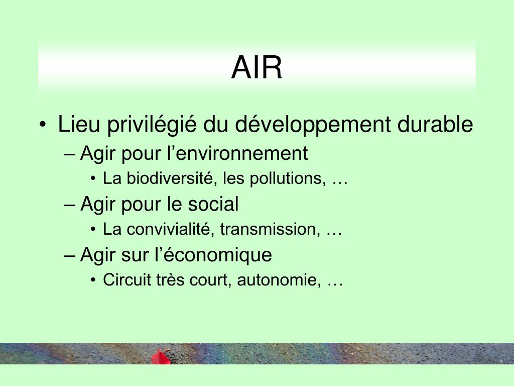 AIR • Lieu privilégié du développement durable • Agir pour l’environnement • La biodiversité, les pollutions, … • Agir pour le social • La convivialité, transmission, … • Agir sur l’économique • Circuit très court, autonomie, …