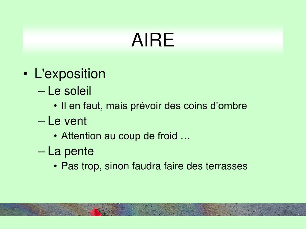 AIRE • L'exposition • Le soleil • Il en faut, mais prévoir des coins d’ombre • Le vent • Attention au coup de froid … • La pente • Pas trop, sinon faudra faire des terrasses