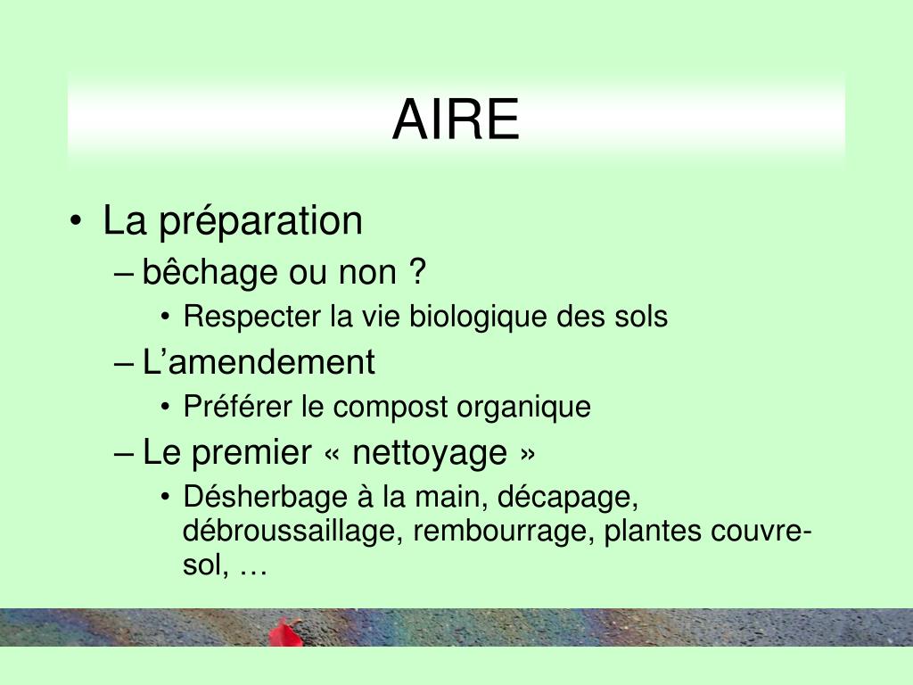 AIRE • La préparation • bêchage ou non ? • Respecter la vie biologique des sols • L’amendement • Préférer le compost organique • Le premier « nettoyage » • Désherbage à la main, décapage, débroussaillage, rembourrage, plantes couvre-sol, …