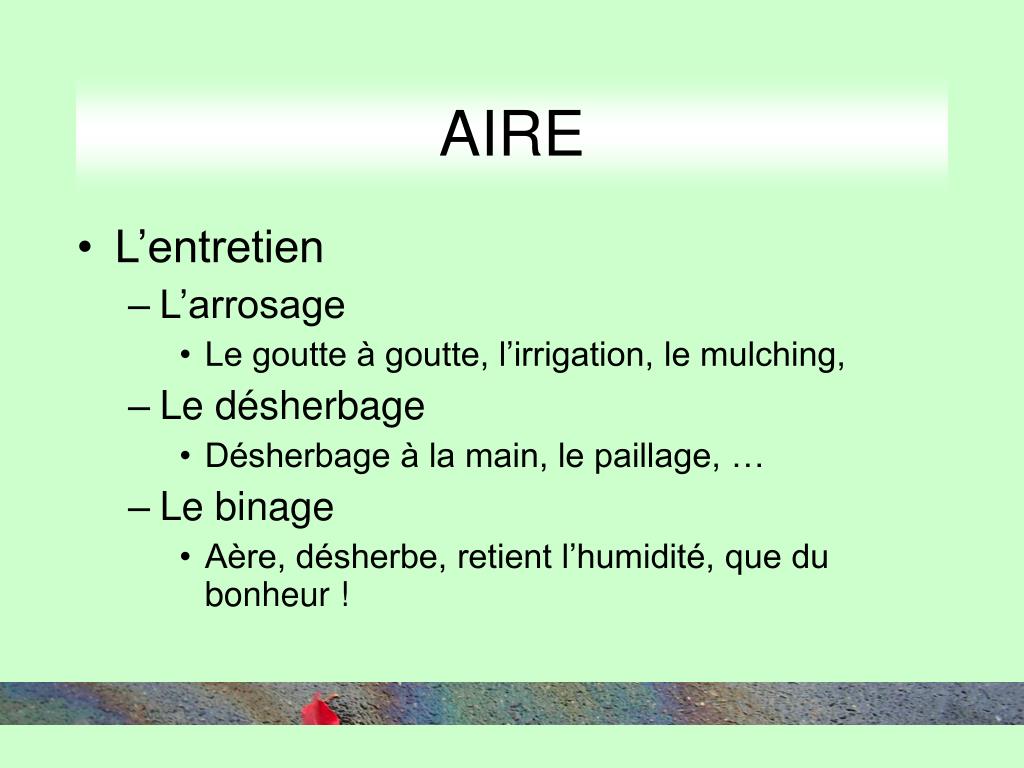 AIRE • L’entretien • L’arrosage • Le goutte à goutte, l’irrigation, le mulching, • Le désherbage • Désherbage à la main, le paillage, … • Le binage • Aère, désherbe, retient l’humidité, que du bonheur !