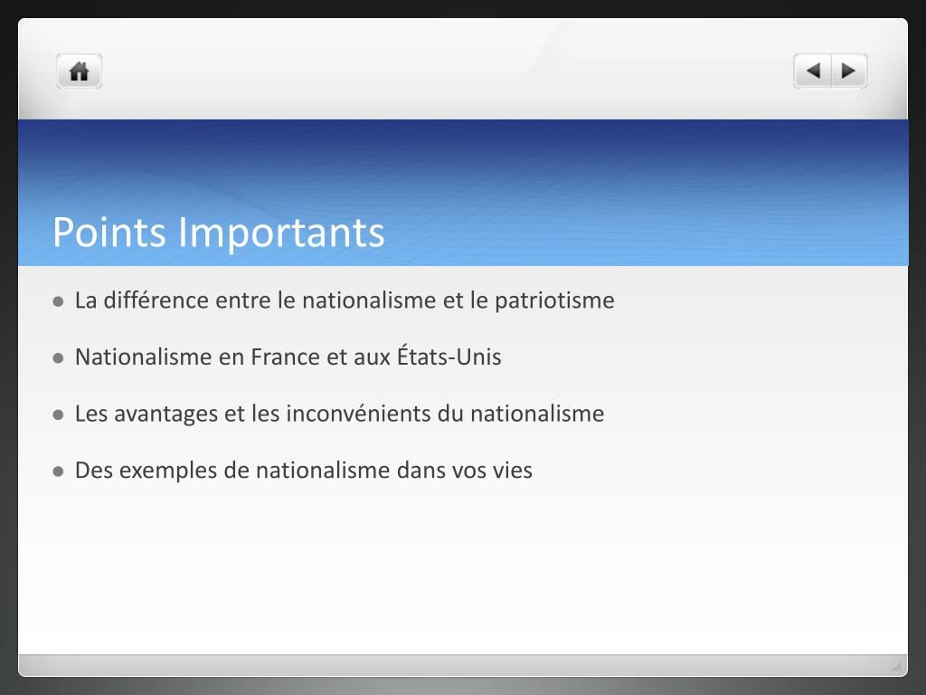 Points Importants • La différence entre le nationalisme et le patriotisme • Nationalisme en France et aux États-Unis • Les avantages et les inconvénients du nationalisme • Des exemples de nationalisme dans vos vies