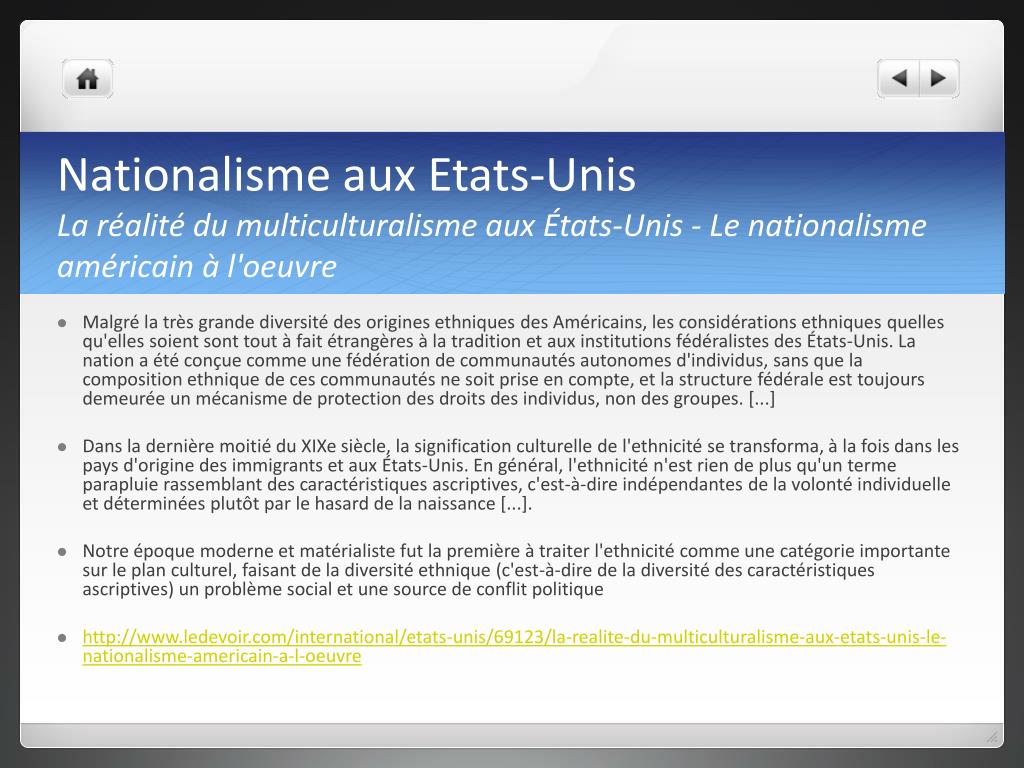 Nationalisme aux Etats-UnisLa réalité du multiculturalisme aux États-Unis - Le nationalismeaméricainàl'oeuvre • Malgré la très grande diversité des origines ethniques des Américains, les considérations ethniques quelles qu'elles soient sont tout à fait étrangères à la tradition et aux institutions fédéralistes des États-Unis. La nation a été conçue comme une fédération de communautés autonomes d'individus, sans que la composition ethnique de ces communautés ne soit prise en compte, et la structure fédérale est toujours demeurée un mécanisme de protection des droits des individus, non des groupes. [...] • Dans la dernière moitié du XIXe siècle, la signification culturelle de l'ethnicité se transforma, à la fois dans les pays d'origine des immigrants et aux États-Unis. En général, l'ethnicité n'est rien de plus qu'un terme parapluie rassemblant des caractéristiques ascriptives, c'est-à-dire indépendantes de la volonté individuelle et déterminées plutôt par le hasard de la naissance [...]. • Notre époque moderne et matérialiste fut la première à traiter l'ethnicité comme une catégorie importante sur le plan culturel, faisant de la diversité ethnique (c'est-à-dire de la diversité des caractéristiques ascriptives) un problème social et une source de conflit politique • http://www.ledevoir.com/international/etats-unis/69123/la-realite-du-multiculturalisme-aux-etats-unis-le-nationalisme-americain-a-l-oeuvre