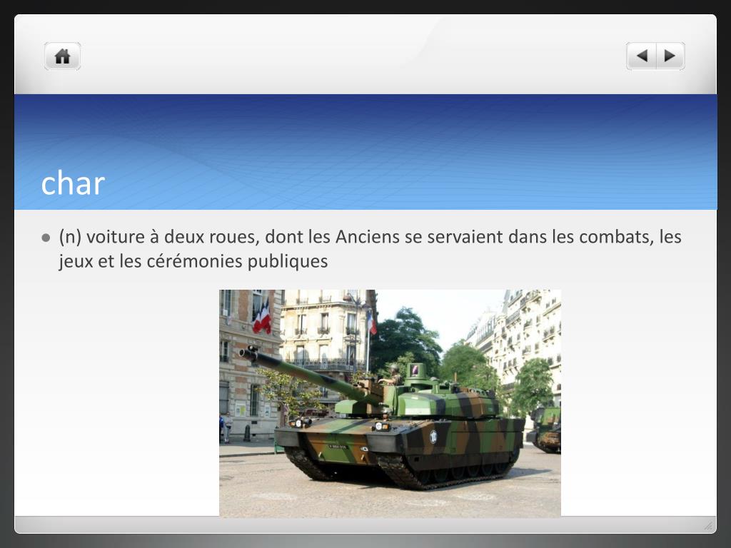 char • (n) voiture à deux roues, dont les Anciens se servaient dans les combats, les jeux et les cérémonies publiques