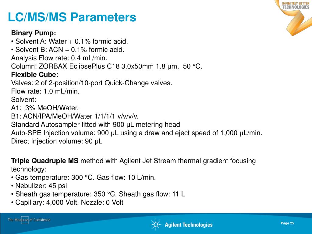 LC/MS/MS Parameters • Binary Pump: • • Solvent A: Water + 0.1% formic acid. • Solvent B: ACN + 0.1% formic acid. • Analysis Flow rate: 0.4 mL/min. • Column: ZORBAX EclipsePlus C18 3.0x50mm 1.8 μm, 50 °C. • Flexible Cube: • Valves: 2 of 2-position/10-port Quick-Change valves. • Flow rate: 1.0 mL/min. • Solvent: • A1: 3% MeOH/Water, • B1: ACN/IPA/MeOH/Water 1/1/1/1 v/v/v/v. • Standard Autosampler fitted with 900 μL metering head • Auto-SPE Injection volume: 900 μL using a draw and eject speed of 1,000 μL/min. • Direct Injection volume: 90 μL Triple Quadruple MS method with Agilent Jet Stream thermal gradient focusing technology: • Gas temperature: 300 °C. Gas flow: 10 L/min. • Nebulizer: 45 psi • Sheath gas temperature: 350 °C. Sheath gas flow: 11 L • Capillary: 4,000 Volt. Nozzle: 0 Volt