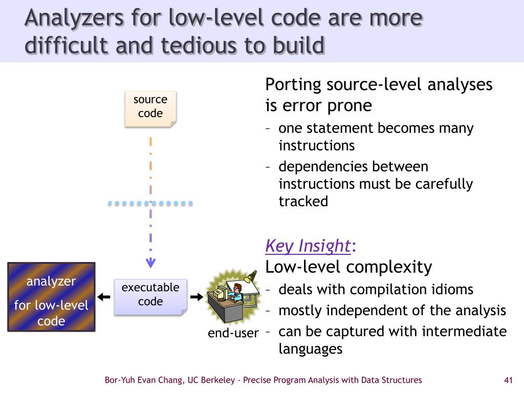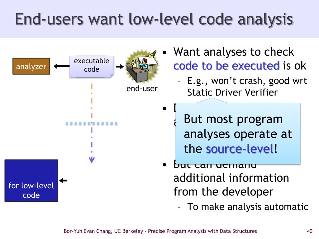End-users want low-level code analysis • Want analyses to check code to be executed is ok • E.g., won’t crash, good wrt Static Driver Verifier • Do not know any details about the program • Analysis must be fully automatic • But can demand additional information from the developer • To make analysis automatic source code analyzer • But most program analyses operate at the source-level! for low-level code executable code end-user Bor-Yuh Evan Chang, UC Berkeley - Precise Program Analysis with Data Structures