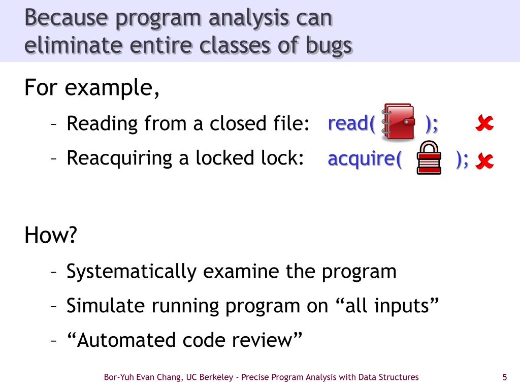 Because program analysis caneliminate entire classes of bugs For example, • Reading from a closed file: • Reacquiring a locked lock: How? • Systematically examine the program • Simulate running program on “all inputs” • “Automated code review”   acquire( ); read( ); Bor-Yuh Evan Chang, UC Berkeley - Precise Program Analysis with Data Structures