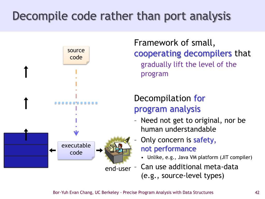 Decompile code rather than port analysis Framework of small, cooperating decompilersthat gradually lift the level of the program Decompilationfor program analysis • Need not get to original, nor be human understandable • Only concern is safety, not performance • Unlike, e.g., Java VM platform (JIT compiler) • Can use additional meta-data (e.g., source-level types) source code for low-level code analyzer executable code end-user Bor-Yuh Evan Chang, UC Berkeley - Precise Program Analysis with Data Structures