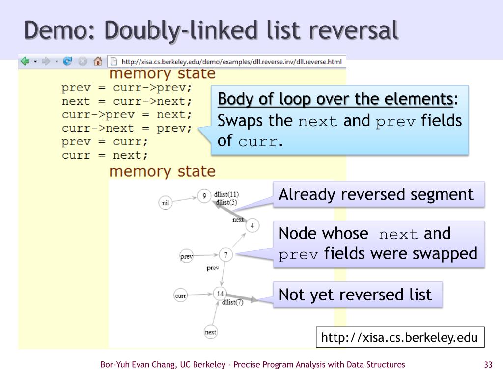 Demo: Doubly-linked list reversal Body of loop over the elements: Swaps the next and prev fields of curr. Already reversed segment Node whose next and prev fields were swapped Not yet reversed list http://xisa.cs.berkeley.edu Bor-Yuh Evan Chang, UC Berkeley - Precise Program Analysis with Data Structures