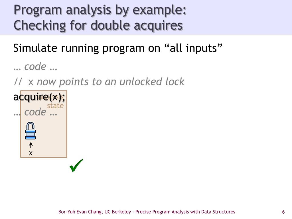 Program analysis by example:Checking for double acquires Simulate running program on “all inputs” …code … // x now points to an unlocked lock acquire(x); • … code … • acquire(x); • … code … analysis state x  Bor-Yuh Evan Chang, UC Berkeley - Precise Program Analysis with Data Structures