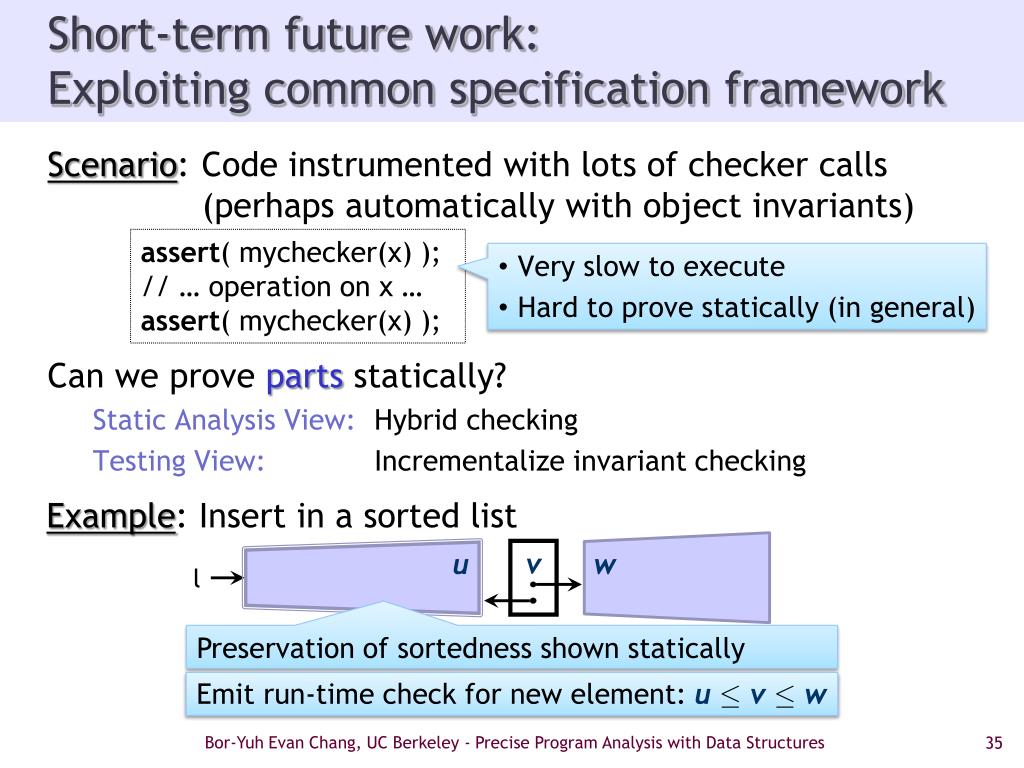 // l is a sorted doubly-linked list for each nodecurinlistl { removecurif duplicate; } assert l is sorted, doubly-linked with no duplicates; Shape analysis by example:Removing duplicates Example/Testing Code Review/Static Analysis program-specific l intermediate state more complicated “segment with no duplicates” “sorted dl list” “sorted dl list” “no duplicates” l l cur cur 2 2 2 4 4 4 2 4 4 l l l Bor-Yuh Evan Chang, UC Berkeley - Precise Program Analysis with Data Structures