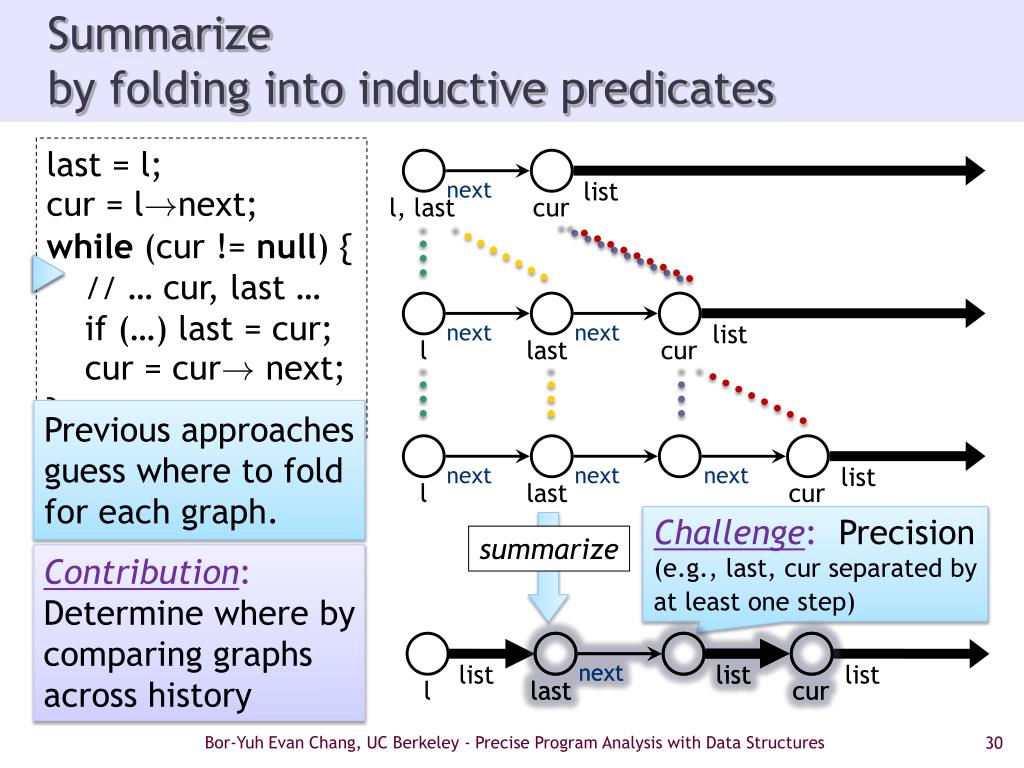 next list l, last cur next next list l last cur next next next list l last cur Summarizeby folding into inductive predicates last = l; cur = l!next; while (cur != null) { // … cur, last … if (…) last = cur; cur = cur! next; } Previous approaches guess where to fold for each graph. Challenge: Precision (e.g., last, cur separated by at least one step) summarize Contribution: Determine where by comparing graphs across history list next next list list list l last last cur cur Bor-Yuh Evan Chang, UC Berkeley - Precise Program Analysis with Data Structures
