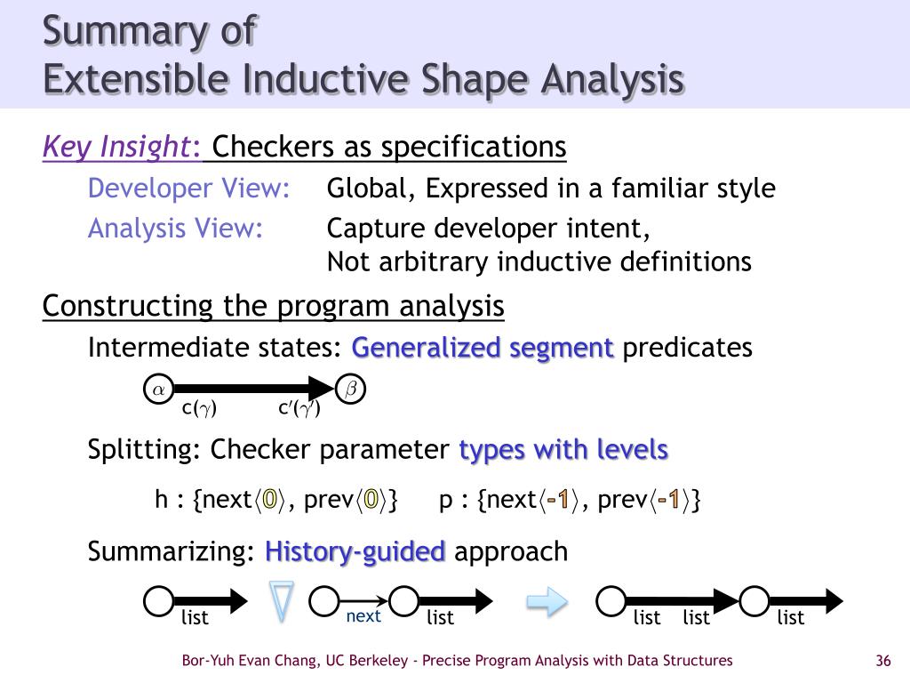 Conclusion Extensible Inductive Shape Analysis precision demanding program analysis improved by novel user interaction Developer: Gets results corresponding to intuition Analysis: Focused on what’s important to the developer Cooperating Decompilers adapt program analyses to code end-users run Practical precise tools for better software! Bor-Yuh Evan Chang, UC Berkeley - Precise Program Analysis with Data Structures