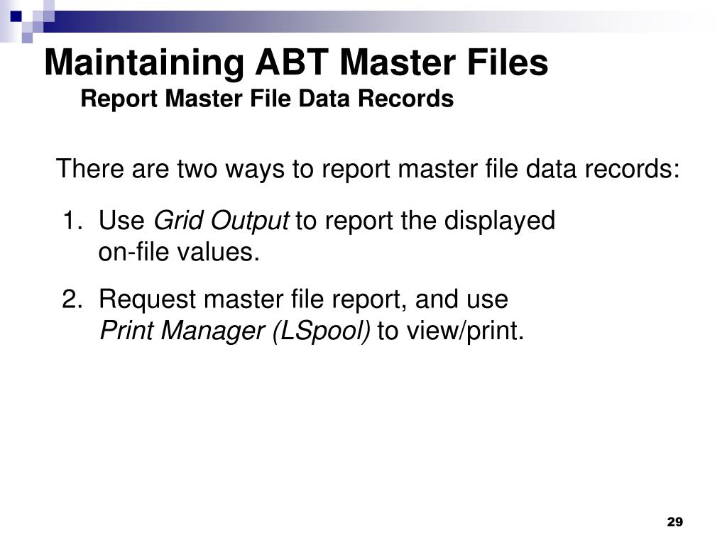 Maintaining ABT Master FilesReport Master File Data Records There are two ways to report master file data records: • Use Grid Output to report the displayed on-file values. • Request master file report, and use Print Manager (LSpool) to view/print.