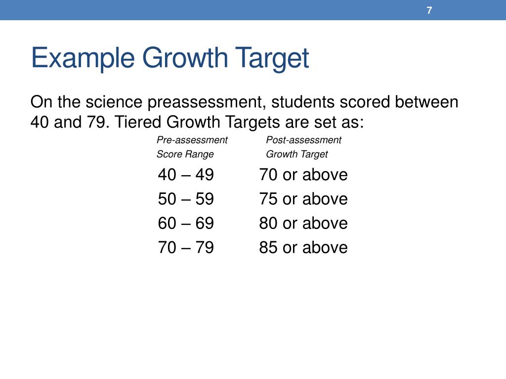 Example Growth Target On the science preassessment, students scored between 40 and 79. Tiered Growth Targets are set as: Pre-assessment Post-assessment Score RangeGrowth Target 40 – 49 70 or above 50 – 59 75 or above 60 – 69 80 or above 70 – 79 85 or above