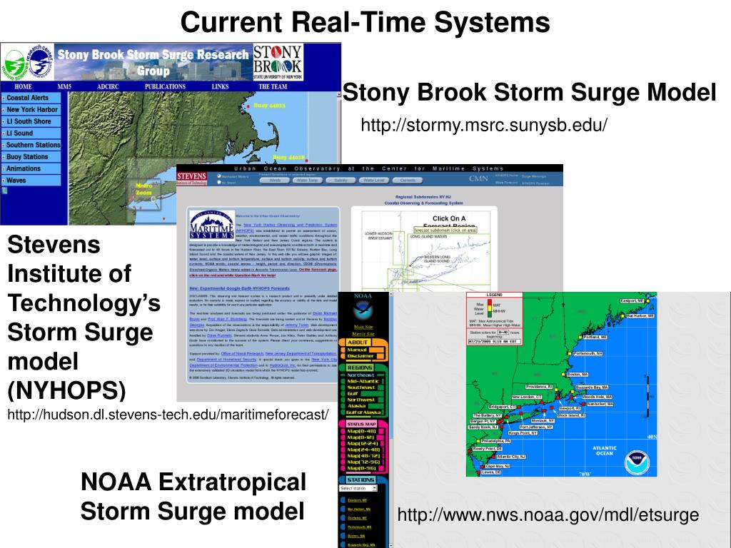 Current Real-Time Systems Stony Brook Storm Surge Model http://stormy.msrc.sunysb.edu/ Stevens Institute of Technology’s Storm Surge model (NYHOPS) http://hudson.dl.stevens-tech.edu/maritimeforecast/ NOAA Extratropical Storm Surge model http://www.nws.noaa.gov/mdl/etsurge