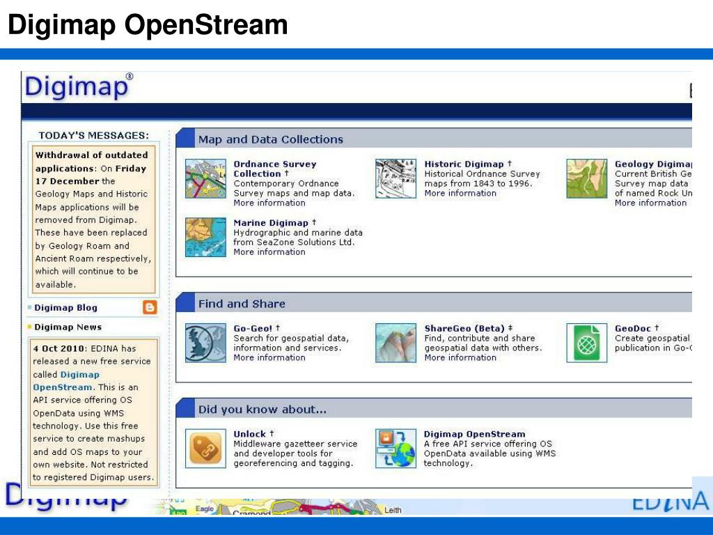 Digimap OpenStream • New service, launched October 2010 • Anyone with a .ac.uk email address can register and use the service • Allows users to stream certain OS data sets directly to their software without downloading and storing large quantities of data • Digimap OpenStream provides access to the following OS OpenData products: • MiniScale® • 1:250,000 Scale Colour Raster • OS Vector Map™ District (Raster) • OS Street View® • http://openstream.edina.ac.uk/terms