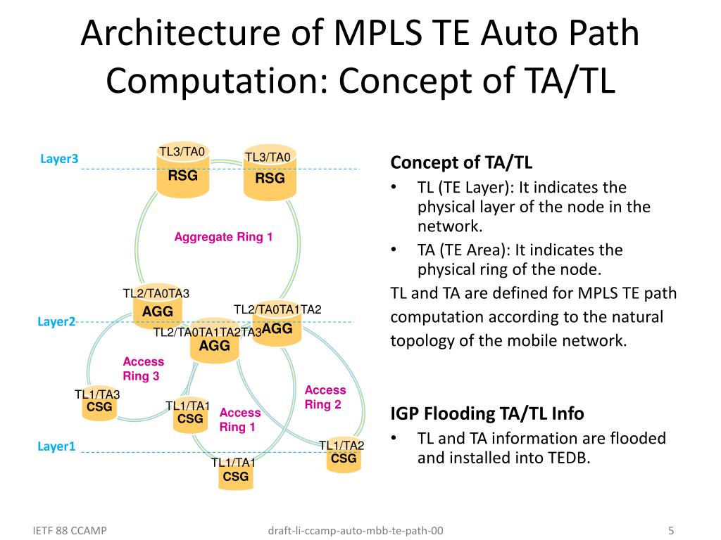 Architecture of MPLS TE Auto Path Computation: Concept of TA/TL TL3/TA0 RSG RSG TL3/TA0 Layer3 • Concept of TA/TL • TL (TE Layer): It indicates the physical layer of the node in the network. • TA (TE Area): It indicates the physical ring of the node. • TL and TA are defined for MPLS TE path • computation according to the natural • topology of the mobile network. • IGP Flooding TA/TL Info • TL and TA information are flooded and installed into TEDB. Aggregate Ring 1 TL2/TA0TA3 AGG TL2/TA0TA1TA2 AGG Layer2 AGG TL2/TA0TA1TA2TA3 Access Ring 3 Access Ring 2 TL1/TA3 CSG TL1/TA1 CSG Access Ring 1 Layer1 TL1/TA2 CSG TL1/TA1 CSG